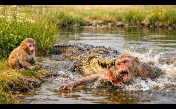 In the heart of the wild African savanna, danger strikes in the blink of an eye. A peaceful troop of monkeys gathers near the riverbank, unaware that a silent predator …